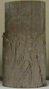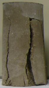 在素土中加入纖維和水泥都能起到提高強(qiáng)度的目的,且提高幅度基本處于同一水平(175-200%),其中素土的強(qiáng)度為0.16MPa,纖維土和水泥土的強(qiáng)度分別為0.44和0.48MPa。但素土、纖維土和水泥土的破壞特征各不相同:素土表現(xiàn)為應(yīng)變軟化的塑性破壞;水泥土表現(xiàn)為完全的脆性破壞,土體強(qiáng)度瞬間喪失,形成的破壞裂隙寬大,相互貫通(圖2(a));纖維土則表現(xiàn)為應(yīng)變硬化的塑性破壞,破壞后土樣中發(fā)育的裂隙相對(duì)比較細(xì)小,呈現(xiàn)裂而不斷的特征(圖2(b)),這對(duì)工程結(jié)構(gòu)的穩(wěn)定性有重要意義。此外,當(dāng)在纖維土中再加入水泥后,強(qiáng)度得到成倍增加,達(dá)到1.18MPa,遠(yuǎn)遠(yuǎn)超過單純的纖維土和水泥土強(qiáng)度之和,說明二者配合使用增強(qiáng)效果更佳,能極大減少材料用量,節(jié)約工程成本。