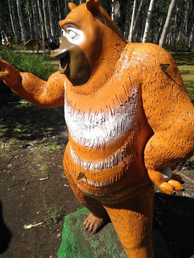 咦,熊二?哈,你沒(méi)看錯(cuò),在這片白樺林里還藏著光頭強(qiáng)的家,熊出沒(méi)的故事在這里得到完美的演繹。瞧,熊二肚子上,膀子上還有蝴蝶在翩翩起舞,同行的孩子說(shuō)是因?yàn)樾芏涿弁党远嗔?,所以把蝴蝶都招?lái)了。呃,好吧,我的娃兒,還是你的想象力夠豐富。