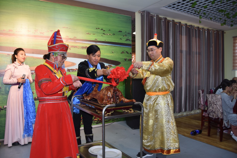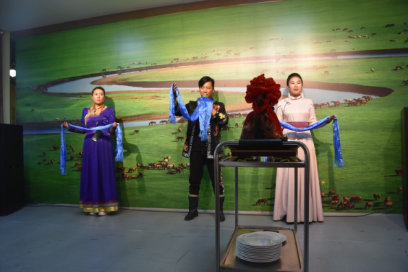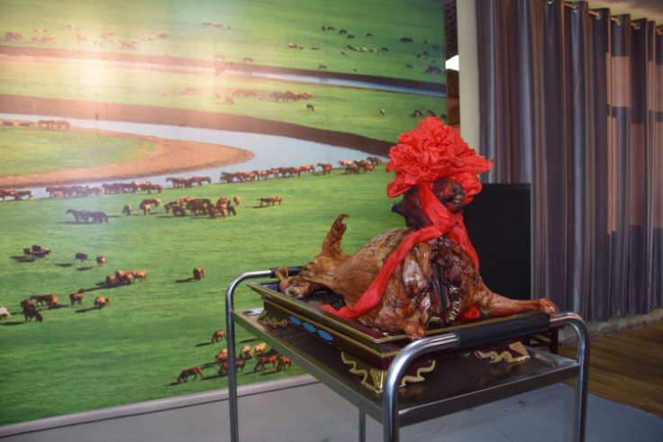 被隊(duì)友坑了一把,愣是穿了一回生平從未穿過(guò)的怪異民族服裝。我上臺(tái)在羊背上劃了一個(gè)十字刀,說(shuō)是寓意著十全十美;又用無(wú)名指沾了酒杯中的酒向上彈一下,再向下彈一下;祭完天后,將酒一飲而盡。儀式結(jié)束,可以開(kāi)始吃嘍!